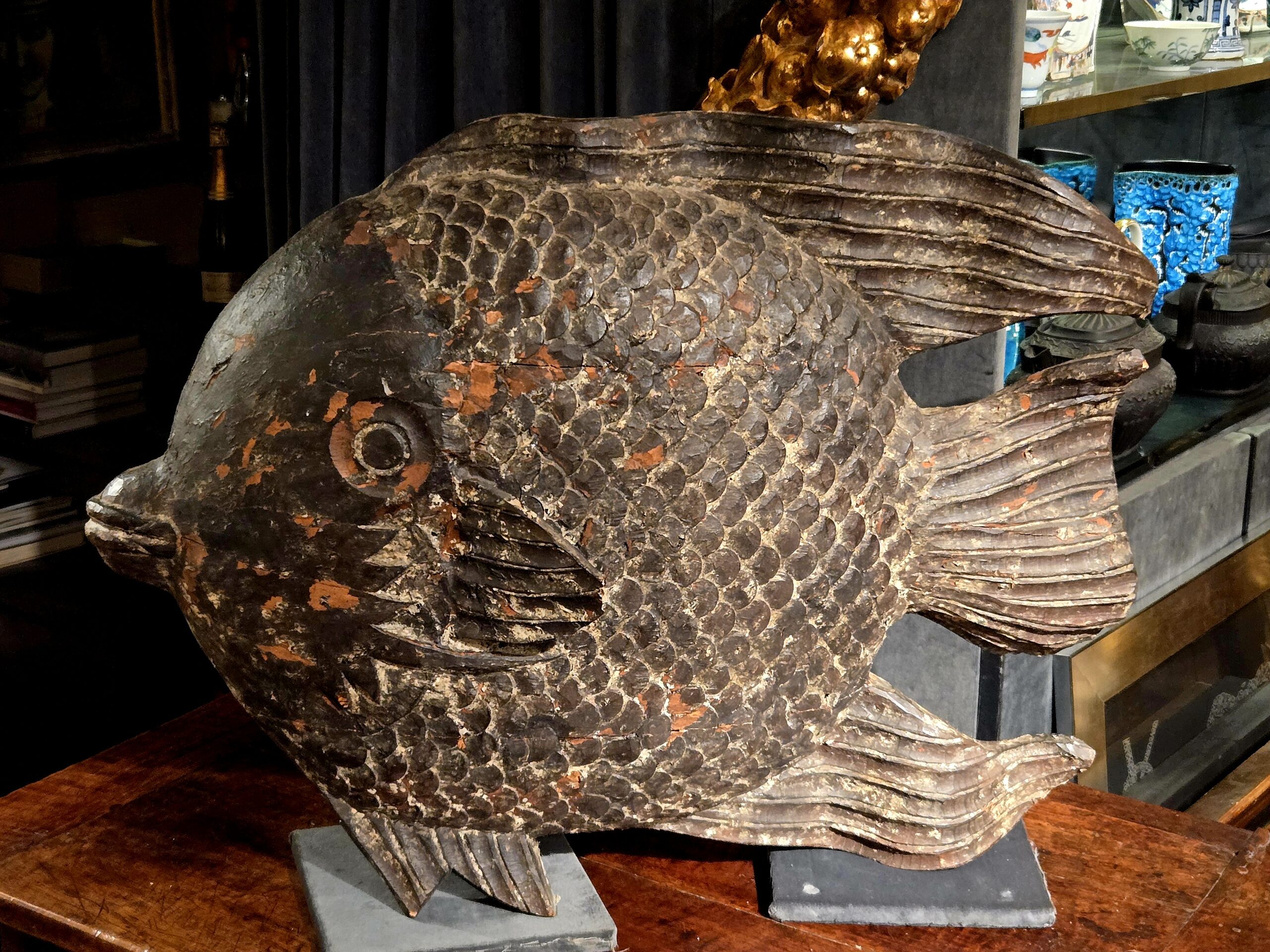 Poisson stylisé en terre cuite avec des écailles bien marquées et une patine ancienne Largeur : 78 cm Hauteur : 59 cm